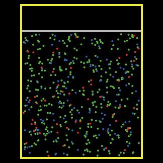 The particles start with the same mass and speed upon the start of the simulation. The mass of the particles stays constant throughout the simulation, whereas, the speeds will change once particles start to collide. Particles are in constant motion colliding with other particles and the walls. All collisions are modeled as elastic collisions, in that the total kinetic energy before and after the collision is conserved. For example, when a fast moving particle collides with a slow moving particle, the fast moving particle will give some of its speed to the slow moving particle. Therefore, the fast moving particle will leave the collision moving slower then when it entered the collision. And the slow moving particle will speed up a bit. The speed in a particle to particle collision is still conserved. The collisions between a particle and a wall is modeled the same way. When the particles hit the wall they transfer momentum to the wall. After this transfer occurs, the particles then bounce off the wall with a different direction and speed. The system's pressure is calculated by averaging the number of collisions the particles have with the walls at each time step.