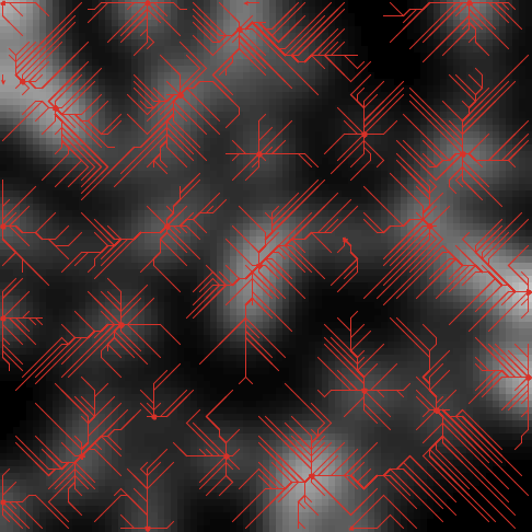This example shows how to make turtles climb hills -- or descend into valleys -- using the uphill, uphill4, downhill, and downhill4 commands. The same technique is useful for modeling any kind of creature that follows a gradient in its environment.