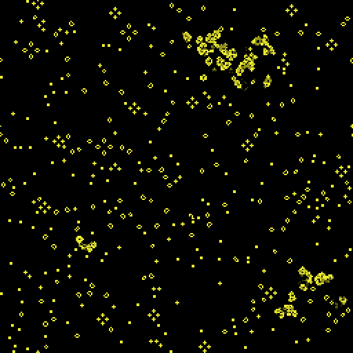 In this implementation, alive sites are shown in bright yellow. Dead sites fade to black.
