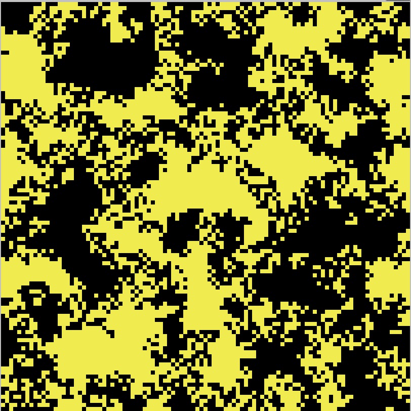 patches-own [ living? ;; indicates if the cell is living live-neighbors ;; counts how many neighboring cells are alive ] to setup-blank clear-all ask patches [ cell-death ] reset-ticks end to setup-random clear-all ask patches [ ifelse random-float 100.0 < initial-density [ cell-birth ] [ cell-death ] ] reset-ticks end to cell-birth set living? true set pcolor fgcolor end to cell-death set living? false set pcolor bgcolor end to go ask patches [ set live-neighbors count neighbors with [living?] ] ;; Starting a new "ask patches" here ensures that all the patches ;; finish executing the first ask before any of them start executing ;; the second ask. This keeps all the patches in synch with each other, ;; so the births and deaths at each generation all happen in lockstep. ask patches [ ifelse (not living?) and (member? live-neighbors [3 6 7 8]) [ cell-birth ] [ if (living?) and (member? live-neighbors [0 1 2 5]) [ cell-death ] ] ] tick end to invert ask patches [ ifelse living? [cell-death] [cell-birth] ] end to draw-cells let erasing? [living?] of patch mouse-xcor mouse-ycor while [mouse-down?] [ ask patch mouse-xcor mouse-ycor [ ifelse erasing? [ cell-death ] [ cell-birth ] ] display ] end