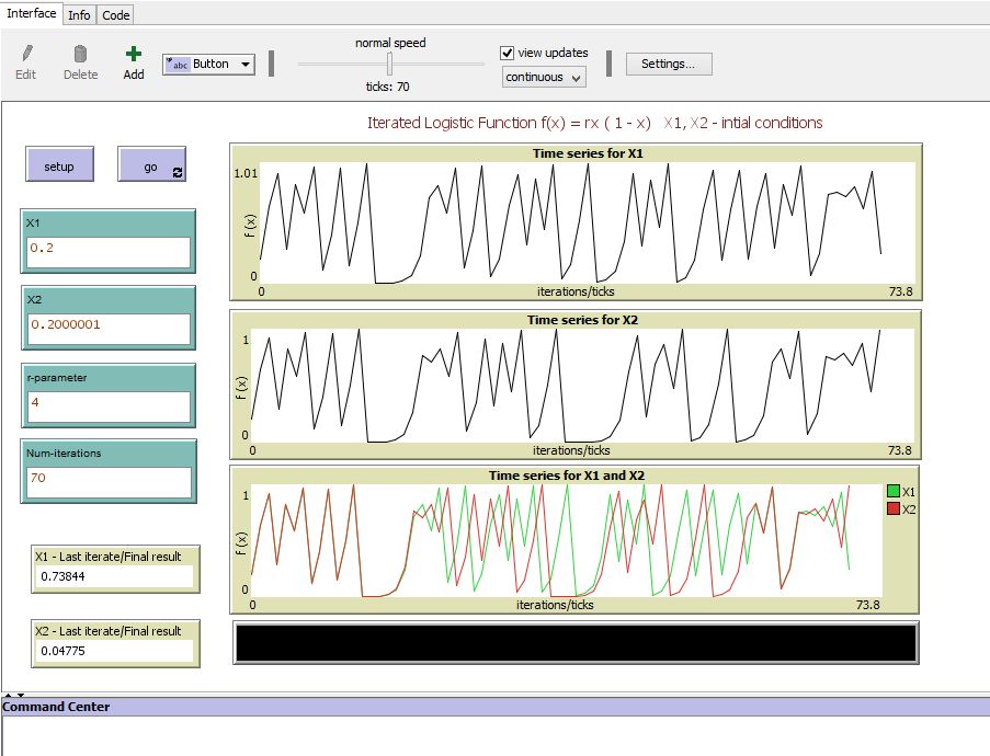 With the setting after the model is just opened two orbits that start very close together (X1=2.0 and X2=2.000001) end up (after 70 iterations) far apart (i.e. X1= 0.73844 and X2= 0.04755). This is known as sensitive dependence on initial conditions, or the butterfly effect.