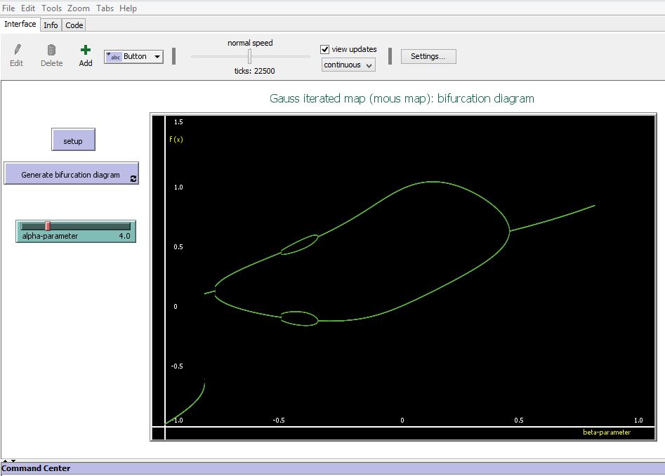 Every time-step (tick) an iteration is performed and as a result a point is generated (i.e. a green color turtle is created) and it is plotted on the plane (where Y-coordinates are obtained as a result of Gaussian function iterations and X-coordinates represent every tick β-increments of 0.00008, with every new β-value participating in the next-step iteration by definition).