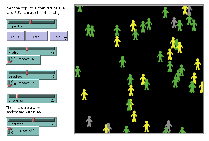 • If you shut off all the randomizing switches, with a population of 1, and set Error-max to zero ( no diversity ), confirm that if Q is less than T, there is no green area ( no one stands at all) and if Q is greater than T, everyone stands on the first pass.