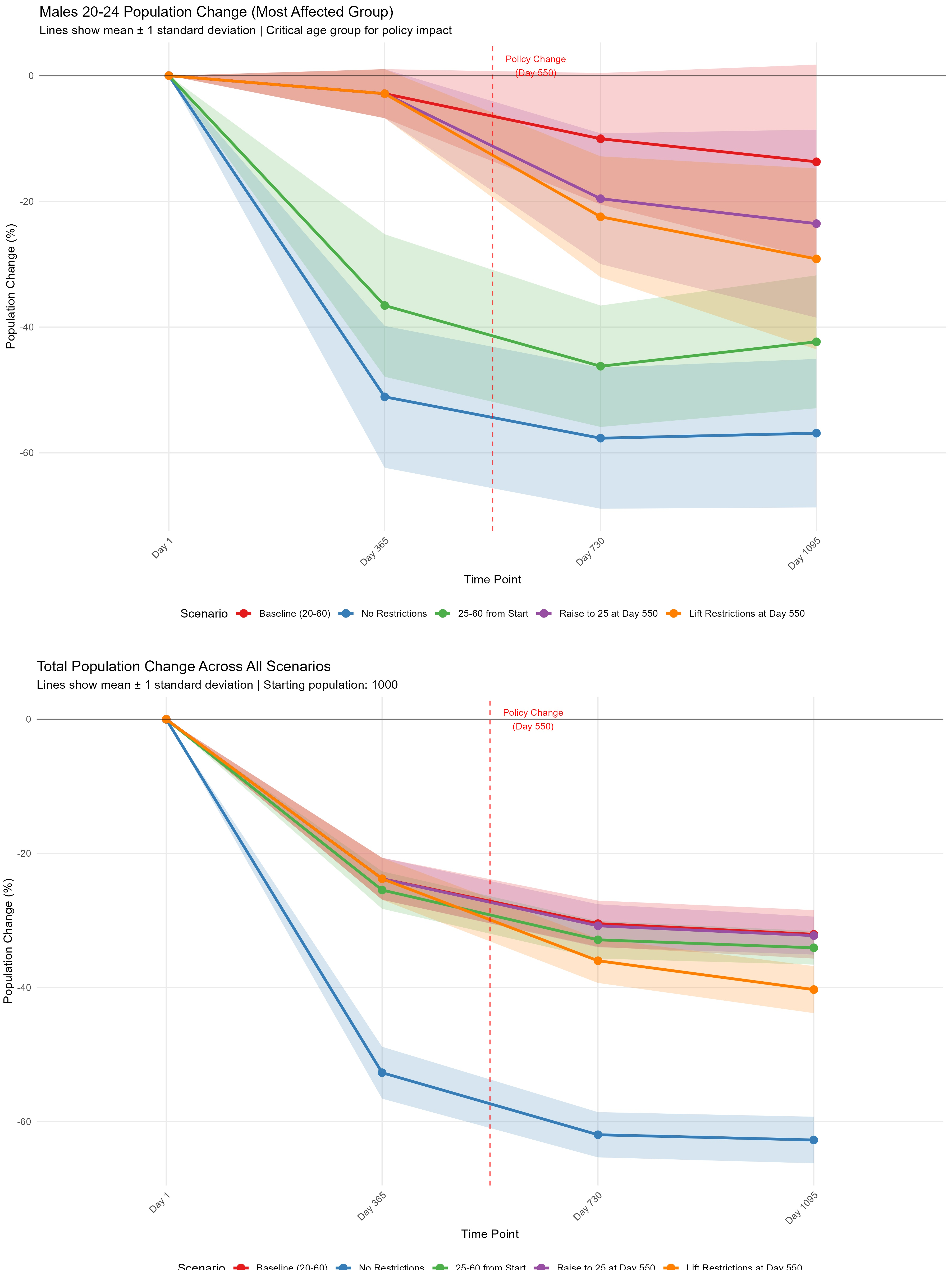 Stress Indicators: - Mean stress levels by demographic - Conscription stress for military-age males - Exit restriction stress for restricted groups
