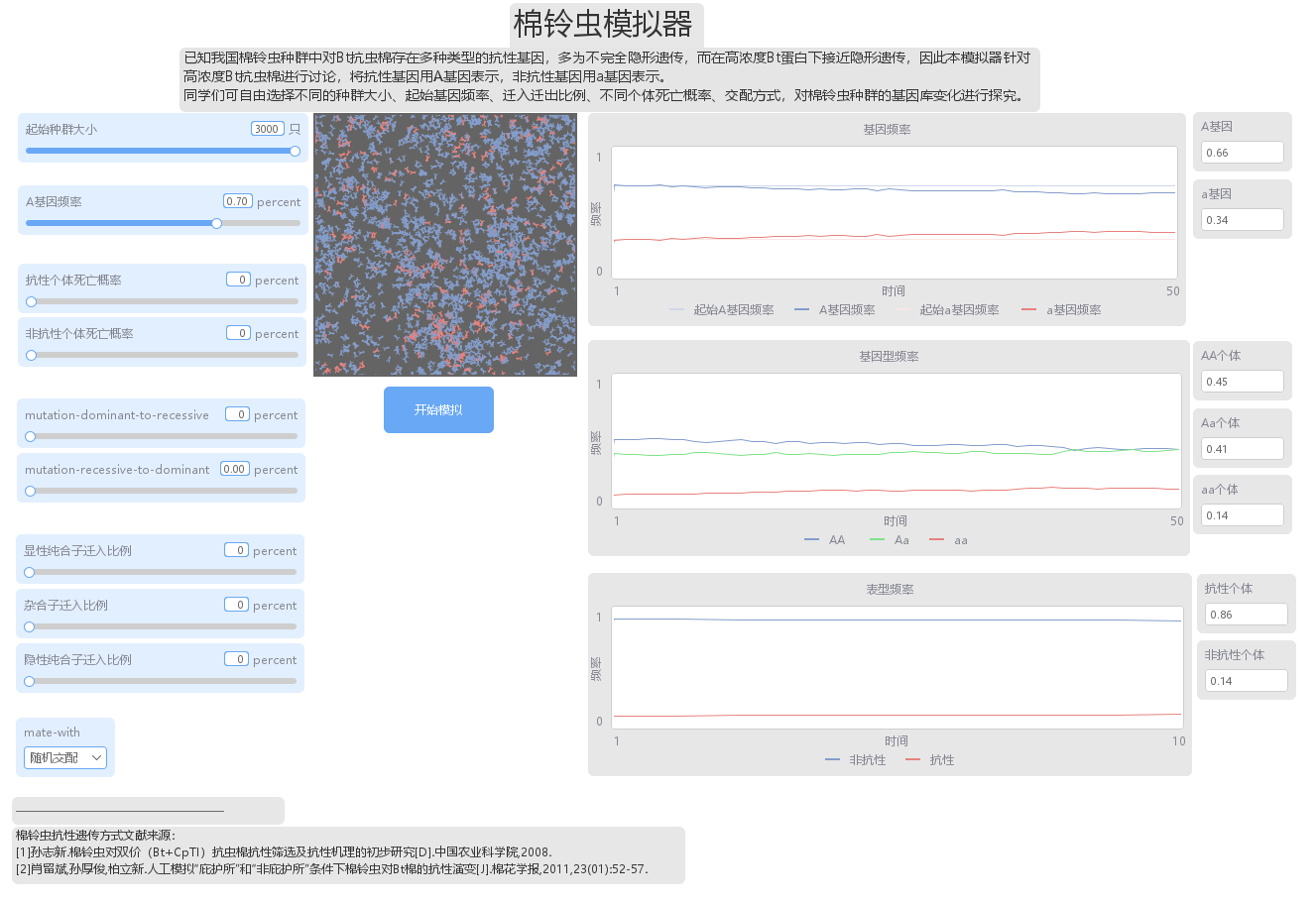 turtles-own [mat-chrom pat-chrom] globals [ max-percent ;; percent of the total population that is in the population-to-cull ;; global population size for culling procedure hw-rec hw-dom hw-homo-rec hw-hetero hw-homo-dom ] to setup ;; (for this model to work with NetLogo's new plotting features, ;; __clear-all-and-reset-ticks should be replaced with clear-all at ;; the beginning of your setup procedure and reset-ticks at the end ;; of the procedure.) __clear-all-and-reset-ticks ;; create turtles with random colors and locations crt 起始种群大小 [ spawn ] set hw-dom ((count turtles with [mat-chrom = 1] + count turtles with [pat-chrom = 1]) / (2 * 起始种群大小)) set hw-rec ((count turtles with [mat-chrom = 2] + count turtles with [pat-chrom = 2]) / (2 * 起始种群大小)) end to spawn ifelse random 100 < (A基因频率 * 100) [ set mat-chrom 1 ] [ set mat-chrom 2 ] ifelse random 100 < (A基因频率 * 100) [ set pat-chrom 1 ] [ set pat-chrom 2 ] ifelse (mat-chrom = 1 or pat-chrom = 1) [ set color blue ] [ set color red ] setxy random-xcor random-ycor let agent-shape species if agent-shape = "human" [ set agent-shape "person"] if agent-shape = "ant" [ set agent-shape "bug"] set shape agent-shape end to run-99 setup repeat 99 [go] end to go if ( ((count turtles with [mat-chrom = 1] = 0 and count turtles with [pat-chrom = 1] = 0) or (count turtles with [mat-chrom = 2] = 0 and count turtles with [pat-chrom = 2] = 0))) or (99 > 0 and ticks > 99 or count turtles = 0) [ stop ] ask turtles [ if ticks = 1 [ cull ] rt random 50 - random 50 fd 1 mutate meet ] immigrate set population-to-cull count turtles ;; show ((population-to-cull - population-size) / population-to-cull) * 100 ask turtles [ cull ] tick end to immigrate crt (起始种群大小 * 显性纯合子迁入比例 * .01) [ set mat-chrom 1 set pat-chrom 1 set color blue setxy random-xcor random-ycor let agent-shape species if agent-shape = "human" [ set agent-shape "person"] if agent-shape = "ant" [ set agent-shape "bug"] set shape agent-shape ] crt (起始种群大小 * 杂合子迁入比例 * .01) [ set mat-chrom 1 set pat-chrom 2 set color blue setxy random-xcor random-ycor let agent-shape species if agent-shape = "human" [ set agent-shape "person"] if agent-shape = "ant" [ set agent-shape "bug"] set shape agent-shape ] crt (起始种群大小 * 隐性纯合子迁入比例 * .01) [ set mat-chrom 2 set pat-chrom 2 set color red setxy random-xcor random-ycor let agent-shape species if agent-shape = "human" [ set agent-shape "person"] if agent-shape = "ant" [ set agent-shape "bug"] set shape agent-shape ] end to meet ;; turtle procedure - when two turtles are adjacent, reproduce (but no self-fertilization!) let mom self let mate nobody ifelse mate-with = "random" [ set mate one-of other turtles ] [ set mate one-of other turtles in-radius 1 ] if mate != nobody [ hatch 1 [ ifelse random 100 < 50 [ set mat-chrom [mat-chrom] of mom ] [ set mat-chrom [pat-chrom] of mom ] ifelse random 100 < 50 [ set pat-chrom [mat-chrom] of mate ] [ set pat-chrom [pat-chrom] of mate ] ifelse (mat-chrom = 1 or pat-chrom = 1) [ set color blue ] [ set color red ] let agent-shape species if agent-shape = "human" [ set agent-shape "person"] if agent-shape = "ant" [ set agent-shape "bug"] set population-to-cull count turtles set shape agent-shape cull ] ] end to mutate ifelse mat-chrom = 1 [ if random 10000 < mutation-dominant-to-recessive * 100 [ set mat-chrom 2] ] [ if random 10000 < mutation-recessive-to-dominant * 100 [ set mat-chrom 1] ] ifelse pat-chrom = 1 [ if random 10000 < mutation-dominant-to-recessive * 100 [ set pat-chrom 2] ] [ if random 10000 < mutation-recessive-to-dominant * 100 [ set pat-chrom 1] ] end to cull let death-chance ((population-to-cull - 起始种群大小) / population-to-cull) * 100 if (抗性个体死亡概率 > 0 and color = blue) [ set death-chance death-chance + ((100 - death-chance) * 抗性个体死亡概率 * .01) ] if (非抗性个体死亡概率 > 0 and color = red) [ set death-chance death-chance + ((100 - death-chance) * 非抗性个体死亡概率 * .01) ] if random 100 < death-chance [ die ] end